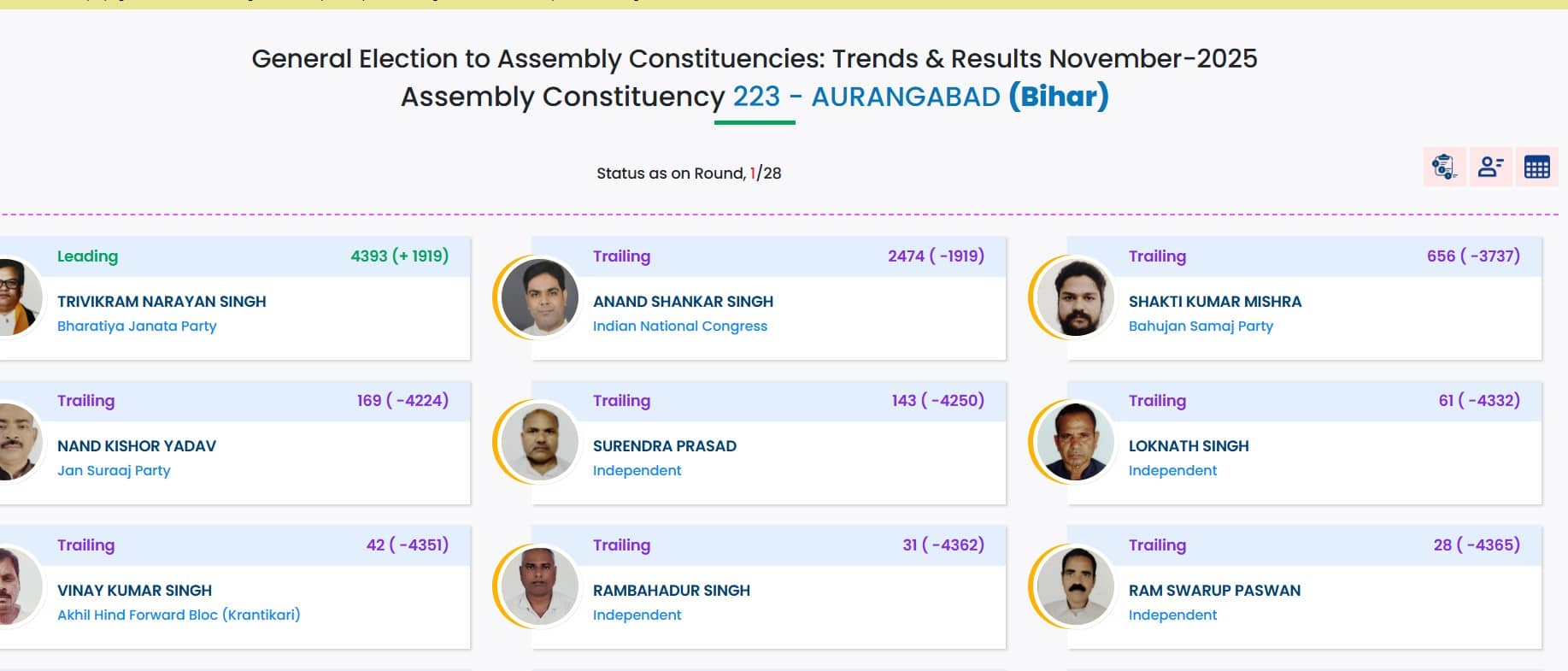 चुनाव आयोग की वेबसाइट के अनुसार औरंगाबाद विधानसभा सीट से फिलहाल BJP के त्रिविक्रम नारायण सिंह आगे चल रहे हैं। कांग्रेस के आनंद शंकर सिंह फिलहाल पीछे चल रहे हैं।