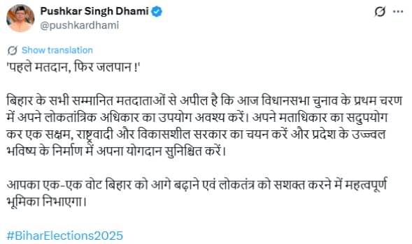 उत्तराखंड के सीएम पुष्कर सिंह धामी ने X पर पोस्ट कर बिहार की जनता से वोटिंग की अपील की। उन्होंने कहा, "पहले मतदान, फिर जलपान बिहार के सभी सम्मानित मतदाताओं से अपील है कि आज विधानसभा चुनाव के प्रथम चरण में अपने लोकतांत्रिक अधिकार का उपयोग अवश्य करें। अपने मताधिकार का सदुपयोग कर एक सक्षम, राष्ट्रवादी और विकासशील सरकार का चयन करें और प्रदेश के उज्ज्वल भविष्य के निर्माण में अपना योगदान सुनिश्चित करें। आपका एक-एक वोट बिहार को आगे बढ़ाने एवं लोकतंत्र को सशक्त करने में महत्वपूर्ण भूमिका निभाएगा।"