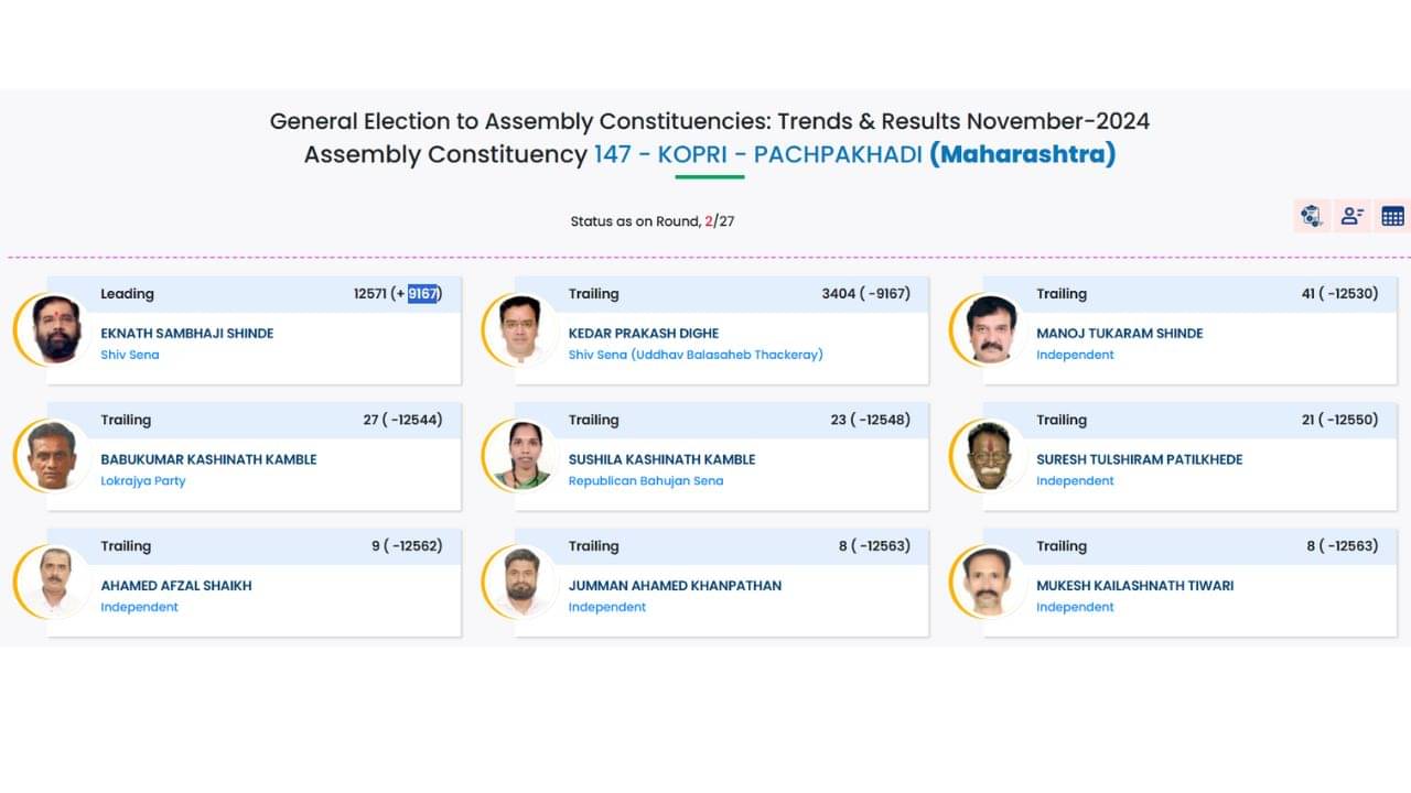 Election Results 2024 Live: महाराष्ट्र की कोपरी-पचपाखड़ी विधानसभा में पहले राउंड की गिनती खत्म हो गई है। महाराष्ट्र के मुख्यमंत्री एकनाथ शिंदे पहले दौर की मतगणना के अंत में कोपरी-पचपाखड़ी विधानसभा सीट से 9167 से अधिक मतों से आगे चल रहे हैं।