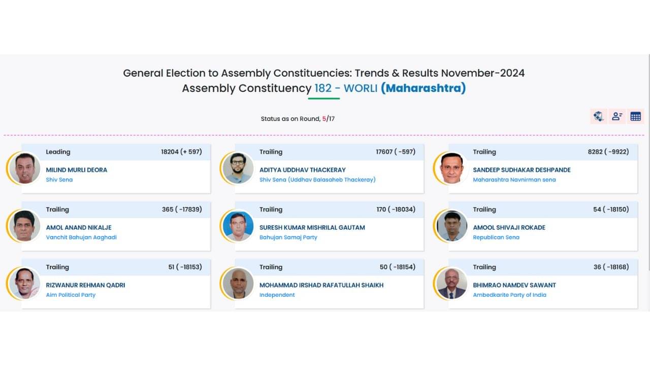 Election Results 2024 Live: महाराष्ट्र की वर्ली सीट पर शिव सेना (उद्धव बालासाहेब ठाकरे) को बड़ा झटका लगा है। शिंदे गुट के मिलिंद मुरली देवड़ा ने 5 रांउड की गिनती के बाद आदित्य उद्धव ठाकरे को पीछे छोड़ दिया है।