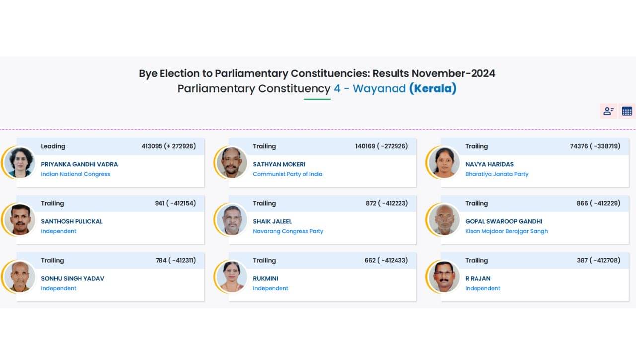 वायनाड संसदीय सीट पर हुए उपचुनाव के रूझानों में लगातार कांग्रेस महासचिव प्रियंका गांधी लगातार अपनी बढ़त को मजबूत करते जा रही हैं और फिलहाल वह 4 लाख से अधिक वोटों से आगे चल रही हैं। यह प्रियंका गांधी के सियासी करियर का पहला चुनाव था जहां उनका मुकाबला भाकपा के वरिष्ठ नेता सत्यन मोकेरी और भाजपा की नव्या हरिदास से था।
