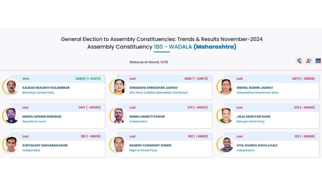 Election Results 2024 Live: महाराष्ट्र में प्रचंड जीत दर्ज करने जा रही बीजेपी ने वडाला सीट पर जीत दर्ज करली है। बीजेपी के कालिदास नीळकंठ कोळंबकर ने शिव सेना (उद्धव बालासाहेब ठाकरे) की प्रत्याशी श्रद्धा श्रीधर जाधव को 24973 वोटो से मात दी है।