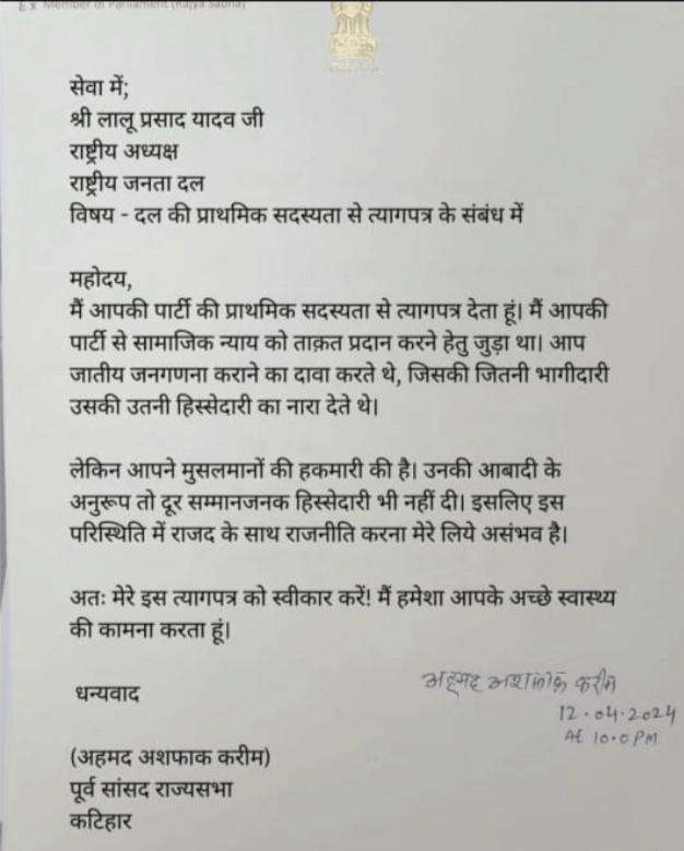 अहमद अशफाक करीम ने RJD को छोड़ा