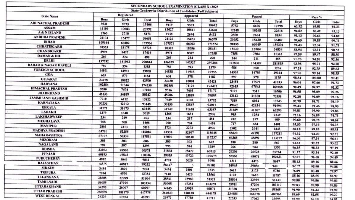 10वीं बोर्ड 2025 में 93.66% छात्र-छात्राएं पास हुई हैं। इस साल के नतीजे पिछले साल के मुकाबले 0.66 प्रतिशत बेहतर रहे हैं। CBSE बोर्ड कक्षा 10वीं के रिजल्ट में इस साल 23 लाख से ज्यादा छात्रों ने रजिस्ट्रेशन कराया था, जबकि 22 लाख 21 हजार 636 स्टूडेंट्स पास हुए हैं। इस साल का कुल पास प्रतिशत 93.66 रहा है। 10वीं बोर्ड में भी लड़कियों ने बाजी मारी है।