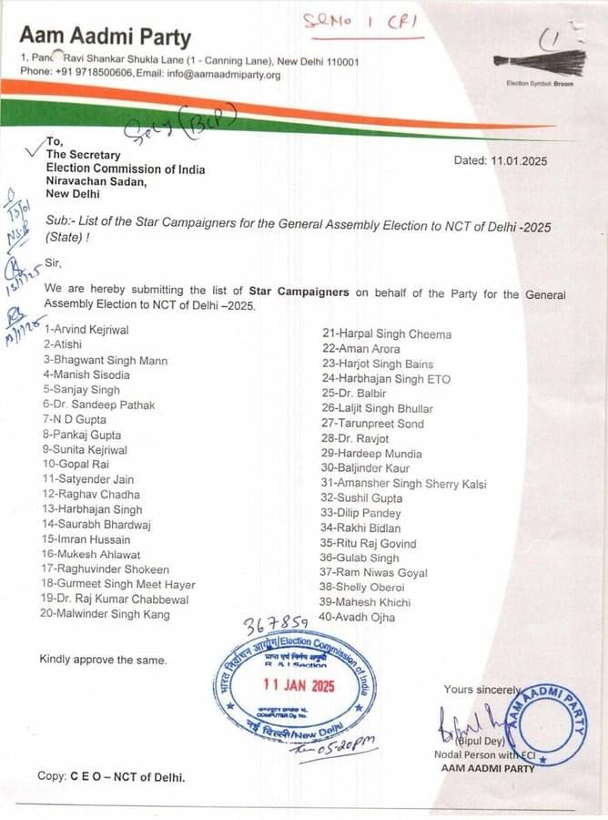 आम आदमी पार्टी ने दिल्ली विधानसभा चुनाव 2025 के लिए 40 स्टार प्रचारकों की सूची जारी की।
