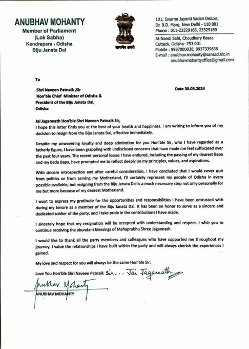 ओडिशा से बड़ी खबर सामने आई है। केंद्रपाड़ा से BJD के लोकसभा सांसद अनुभव मोहंती ने पार्टी छोड़ दी है।