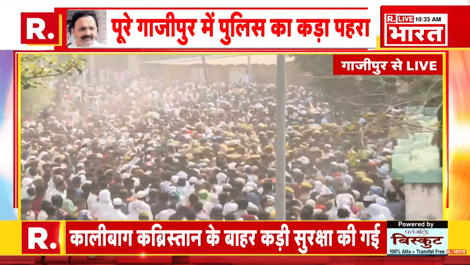 कालीबाग कब्रिस्तान के बाहर भारी भीड़ जमा हो गई जहां माफिया मुख्तार अंसारी को थोड़ी देर में दफ्नाया जाएगा।