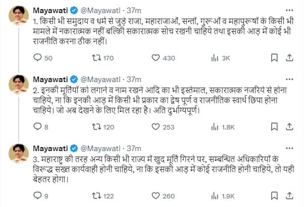 बीएसपी सुप्रीमो मायावती ने महाराष्ट्र में छत्रपति शिवाजी महाराज की मूर्ति गिरने पर प्रतिक्रिया दी है। उन्होंने कहा कि किसी भी समुदाय व धर्म से जुड़े राजा, महाराजाओं, सन्तों, गुरूओं व महापुरूषों के किसी भी मामले में नकारात्मक नहीं बल्किी सकारात्मक सोच रखनी चाहिये तथा इसकी आड़ में कोई भी राजनीति करना ठीक नहीं।