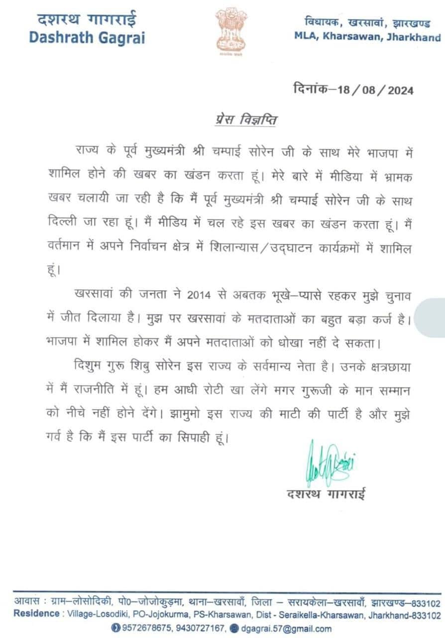 चंपई के साथ जेएमएम विधायक दशरथ गागराई का नाम भी खबरों में चल रहा था कि वो भी चंपई के साथ बीजेपी में शामिल हो सकते हैं। बीजेपी में शामिल होने की अटकलों के बीच दशरथ गागराई एक चिट्ठी लिखकर इन सभी अटकलों को खारिज किया है। उन्होंनें कहा कि मैं गुरुजी यानी शिबू सोरेन के मान सम्मान को नीचा नहीं होने दूंगा। मैं JMM साथ खड़ा हूं।