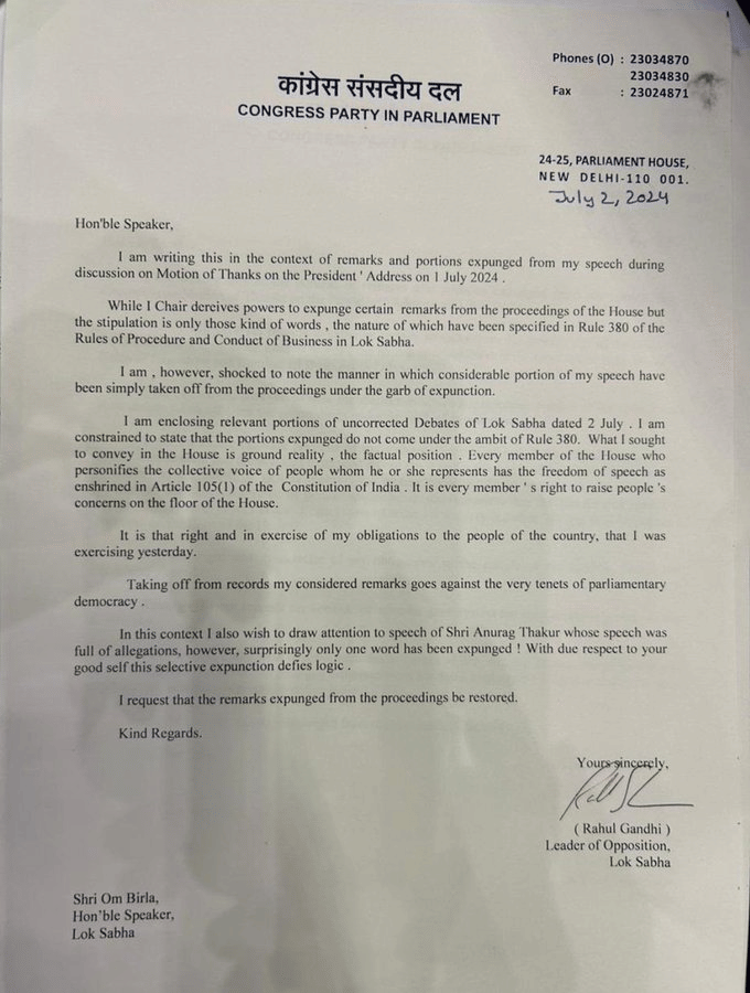 लोकसभा में विपक्ष के नेता और कांग्रेस सांसद राहुल गांधी ने अपने भाषण से हटाई गई टिप्पणियों और अंशों को लेकर अध्यक्ष ओम बिरला को पत्र लिखा। अनुरोध किया है कि टिप्पणियों को बहाल किया जाए। पत्र में लिखा कि "यह देखकर स्तब्ध हूं कि जिस तरह से मेरे भाषण के काफी हिस्से को निष्कासन की आड़ में कार्यवाही से हटा दिया गया है...मेरी सुविचारित टिप्पणियों को रिकॉर्ड से हटा देना संसदीय लोकतंत्र के सिद्धांतों के खिलाफ है।"