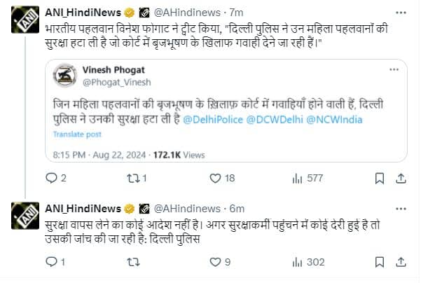 India News Live: भारतीय पहलवान विनेश फोगाट ने सोशल मीडिया प्लेटफॉर्म एक्स पर पोस्ट किया, "दिल्ली पुलिस ने उन महिला पहलवानों की सुरक्षा हटा ली है जो कोर्ट में बृजभूषण के खिलाफ गवाही देने जा रही हैं।"