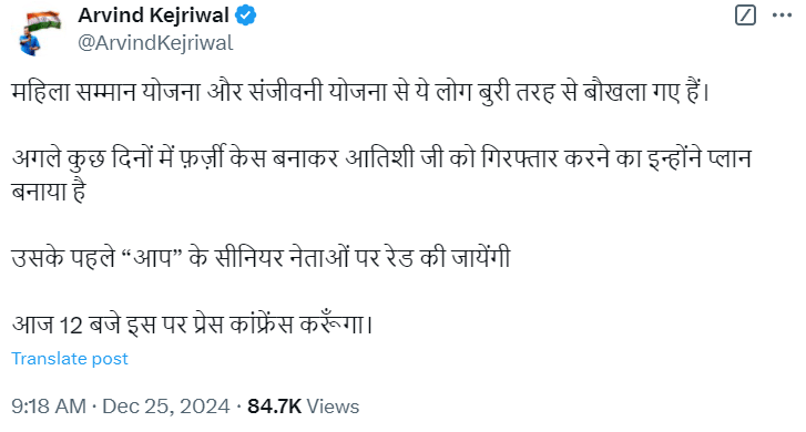 दिल्ली में महिला सम्मान योजना और संजीवनी स्कीम पर बड़े खुलासे के बीच AAP के राष्ट्रीय संयोजक अरविंद केजरीवाल ने आशंका जताई है कि अगले कुछ दिनों में मुख्यमंत्री आतिशी को गिरफ्तार किया जा सकता है। केजरीवाल ने 'X' पर लिखा- ‘महिला सम्मान योजना और संजीवनी योजना से ये लोग बुरी तरह से बौखला गए हैं। अगले कुछ दिनों में फर्जी केस बनाकर आतिशी को गिरफ्तार करने का इन्होंने प्लान बनाया है। उसके पहले AAP के सीनियर नेताओं पर रेड की जाएंगी। आज 12 बजे इस पर प्रेस कांफ्रेंस करूंगा।’