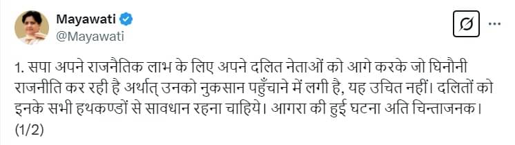 बसपा प्रमुख मायावती ने अखिलेश यादव पर निशाना साधते हुए कहा कि सपा अपने राजनैतिक लाभ के लिए अपने दलित नेताओं को आगे करके जो घिनौनी राजनीति कर रही है अर्थात् उनको नुकसान पहुंचाने में लगी है, यह उचित नहीं। दलितों को इनके सभी हथकण्डों से सावधान रहना चाहिये। आगरा की हुई घटना अति चिन्ताजनक। साथ ही, सपा को अपने स्वार्थ में किसी भी समुदाय का अपमान करना ठीक नहीं, जिसके तहत अब इनको किसी समुदाय में दुर्गन्ध व किसी में सुगन्ध आ रही है। इससे समाज में अमन-चैन व सौहार्द बिगड़ेगा, जो ठीक नहीं।