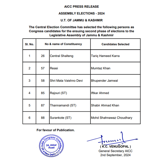 कांग्रेस पार्टी ने जम्मू-कश्मीर में आगामी विधानसभा चुनावों के लिए 6 उम्मीदवारों की सूची जारी की।