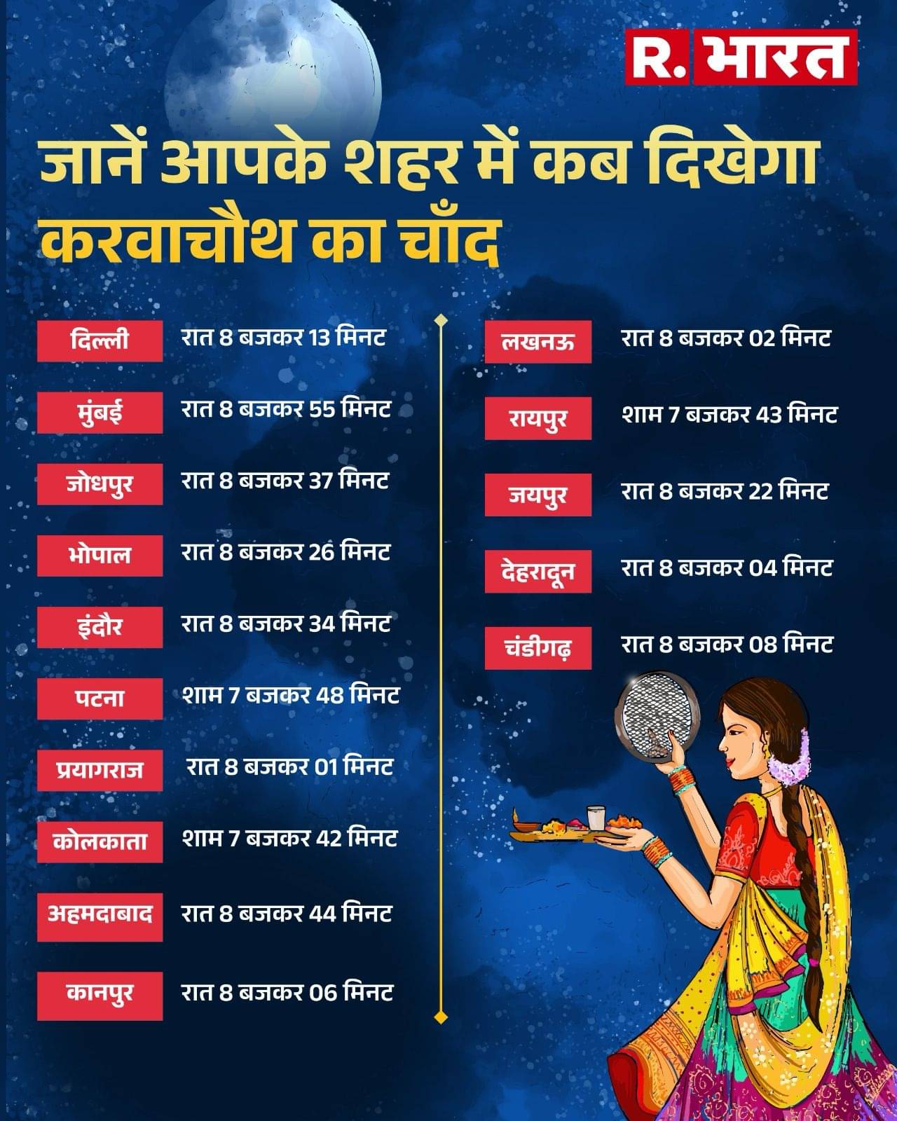 अलग-अलग शहरों में चांद 15-20 मिनट देरी से निकलेगा। वहीं चांद निकलने का स्मयी 8:15 हो सकता है।