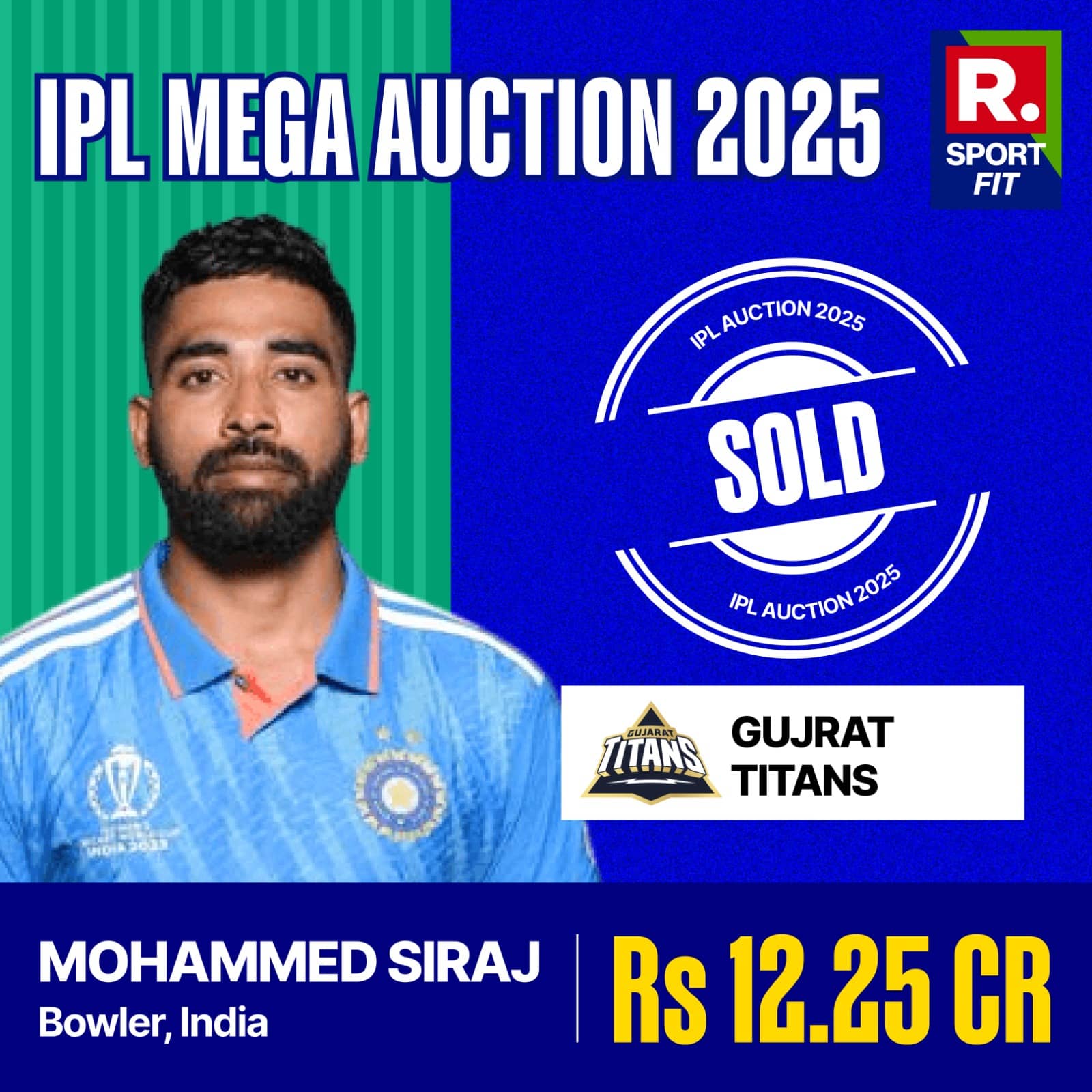 विराट कोहली की RCB से खेलने वाले मोहम्मद सिराज अब IPL 2025 में गुजरात टाइटन्स में खेलते हुए दिखेंगे। गुजरात ने उनको 12.25 करोड़ रुपए में अपनी टीम में शामिल किया है। आरसीबी ने मोहम्मद सिराज के लिए आरटीएम का इस्तेमाल नहीं किया। गुजरात के बॉलिंग अटैक में अब राशिद खान, कगिसो रबाडा और मोहम्मद सिराज हैं।