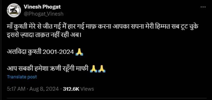 Paris Olympics 2024 Live: पेरिस ओलंपिक में दिल टूटने के बाद भारत की स्टार महिला पहलवान विनेश फोगाट ने कुश्ती से संन्यास लेने का ऐलान कर दिया है। उन्होंने इस बात की जानकारी सोशल मीडिया पोस्ट के जरिये दी है।