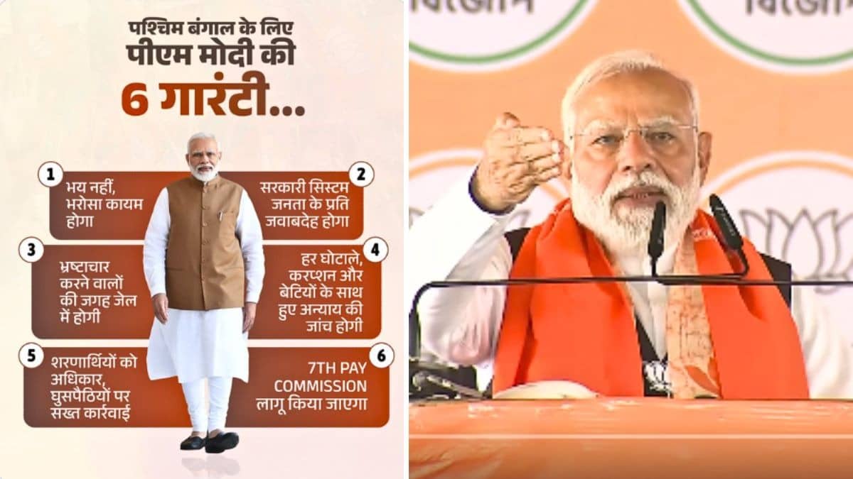 प्रधानमंत्री ने आरोप लगाया कि बंगाल में बालू, पत्थर और कोयला की लूट TMC के बड़े नेताओं के आशीर्वाद से चल रही है। उन्होंने कहा कि, 'बंगाल की माटी पर घुसपैठियों का कब्जा खतरनाक स्तर पर पहुंच गया है। TMC फर्जी सरकारी दस्तावेज बनवा रही है।' पीएम मोदी ने चुनावी जनसभा को संबोधित करते हुए पश्चिम बंगाल के लिए छह गारंटी दीं। उन्होंने कहा कि भाजपा सरकार बनने पर कानून का राज स्थापित होगा, भ्रष्टाचार और गुंडागर्दी पर सख्त कार्रवाई होगी।