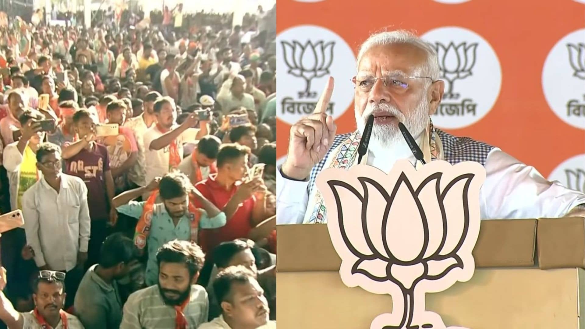 पीएम मोदी ने कहा, "एक ओर टीएमसी का भय है, और इसका मुकाबला करने के लिए आपके पास भाजपा का भरोसा है। एक ओर टीएमसी के कटमनी और करप्शन का भय है, दूसरी ओर विकास को तेज रफ्तार देने वाली भाजपा का भरोसा है। एक ओर घुसपैठ कराकर, विदेशियों को यहां बसाने का भय है, दूसरी ओर घुसपैठ रोककर सारे घुसपैठियों को बंगाल से बाहर करने का भाजपा का भरोसा है।"