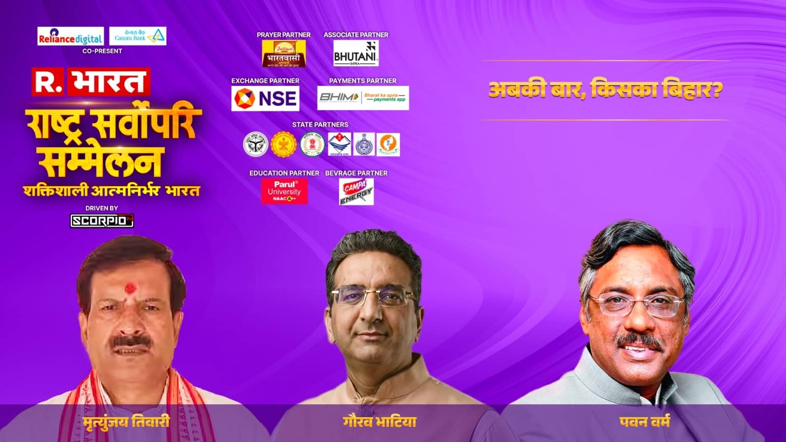 देश के नंबर 1 न्यूज चैनल ‘रिपब्लिक भारत’ के राष्ट्र सर्वोपरि सम्मेलन 2025 -' शक्तिशाली आत्मनिर्भर' भारत का शंखनाद हो गया है। मंच पर राजनीति, कला और व्यापार जगत की कई दिग्गज हस्तियां शिरकत कर रहे हैं। बिहार में विधानसभा चुनाव से पहले रिपब्लिक के मंच पर BJP, RJD और जन सुराज के प्रवक्ता के साथ 'आपकी बार, किसका बिहार' विषय पर चर्चा हुई। इस चर्चा में शामिल होने के लिए बीजेपी से गौरव भाटिया, आरजेडी से मृत्युंजय तिवारी और जन सुराज से पवन वर्मा पहुंचे।