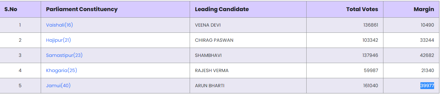 समस्तीपुर से शाम्भवी बढ़त बनाई हुईं हैं। खगरिया से लोजपा (राम विलास) प्रत्याशी राजेश वर्मा आगे चल रहे हैं और जमुई से अरुण भारती 39977 वोटों की मार्जिन के साथ जीत की तरफ बढ़ रहे हैं।