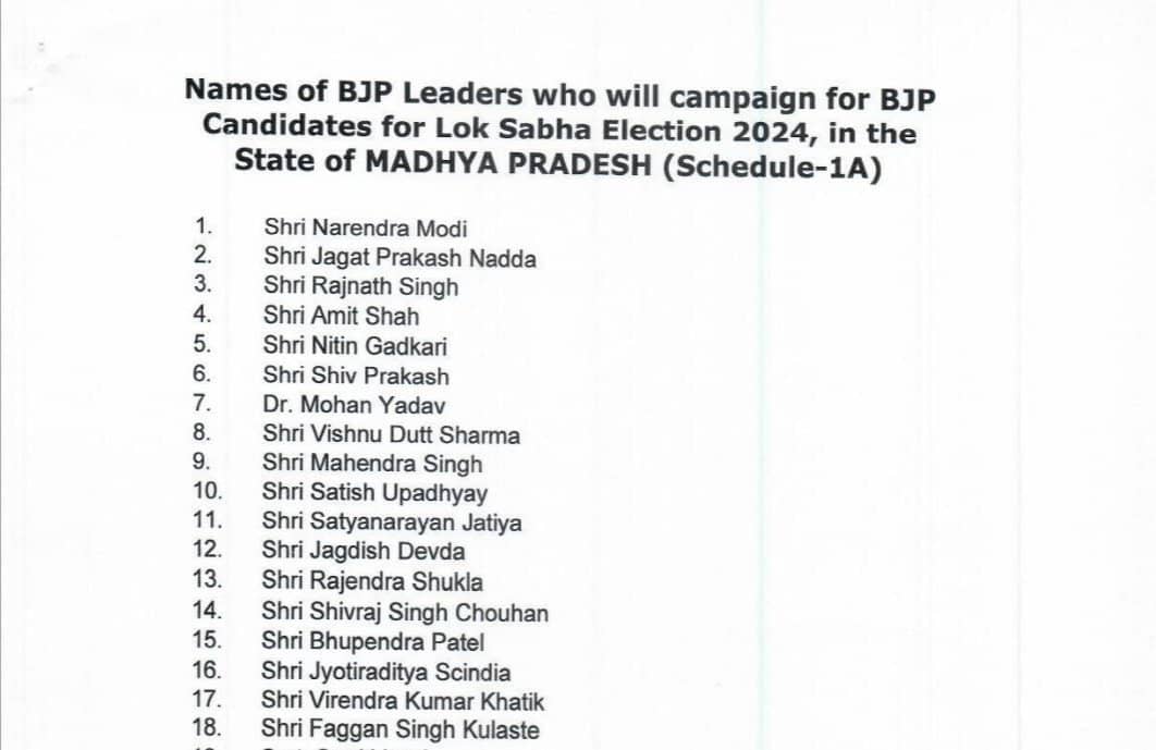 भारतीय जनता पार्टी ने मध्य प्रदेश में लोकसभा चुनाव 2024 के लिए में कैंपेनिंग लिस्ट में शामिल नामों का ऐलान कर दिया है। बीजेपी ने इस लिस्ट में 40 स्टार प्रचारकों के नाम जारी किए हैं। इस लिस्ट में प्रधानमंत्री नरेंद्र मोदी, बीजेपी के राष्ट्रीय अध्यक्ष जेपी नड्डा, केंद्रीय रक्षामंत्री राजनाथ सिंह, केंद्रीय गृहमंत्री अमित शाह, केंद्रीय मंत्री नितिन गडकरी,ज्योतिरादित्य सिंधिया और मुंख्यमंत्री डॉ. मोहन यादव सहित वीडी शर्मा का नाम भी शामिल है। ये नेता मध्यप्रदेश के लोकसभा उम्मीदवारों के लिए अलग-अलग चुनावी क्षेत्रों में बीजेपी उम्मीदवारों के समर्थन में चुनाव प्रचार करेंगे।