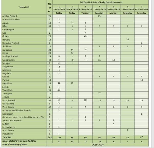 छठवें चरण में 7 चरणों में चुनाव होंगे, जिसमें बिहार, हरियाणा, झारखंड, ओडिशा, उत्तर प्रदेश, पश्चिम बंगाल और दिल्ली शामिल हैं।