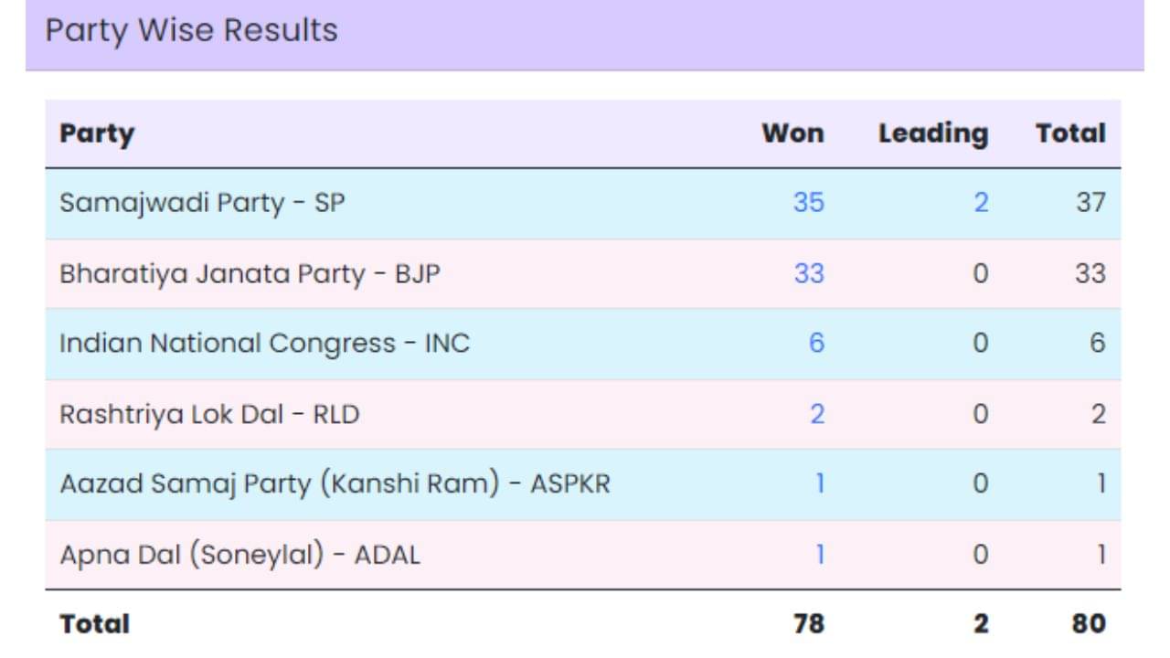 चुनाव आयोग के आंकड़ों के मुताबिक उत्तर प्रदेश में सपा को 37, बीजेपी को 33 और कांग्रेस को 6 सीट मिली हैं।