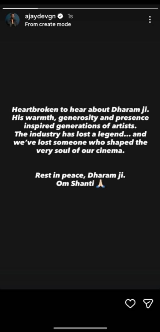 धर्मेंद्र के निधन की खबर सुनकर बॉलीवुड एक्टर अजय देवगन का दिल टूट गया। उन्होंने इंस्टा स्टोरी पर लिखा, 'धरम जी के बारे में सुनकर दिल टूट गया। उनकी गर्मजोशी, उदारता और उपस्थिति ने कलाकारों की पीढ़ियों को प्रेरित किया। उद्योग ने एक किंवदंती खो दी है... और हमने एक ऐसे व्यक्ति को खो दिया है जिसने हमारे सिनेमा की आत्मा को आकार दिया। शांति से आराम करें, धरम जी। ॐ शांति।'