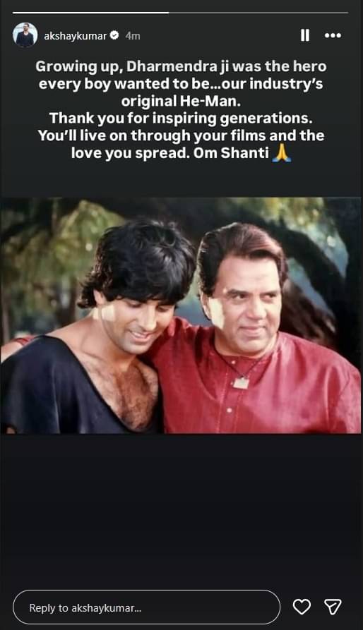 एक्टर अक्षय कुमार ने धर्मेंद्र के निधन पर दुख जताते हुए लिखा, "बड़े होते हुए, धर्मेंद्र जी ऐसे हीरो थे जैसा हर लड़का बनना चाहता था। हमारी इंडस्ट्री के ओरिजिनल ही-मैन। पीढ़ियों को प्रेरित करने के लिए धन्यवाद। आप अपनी फिल्मों और आपके फैलाए गए प्यार के जरिए ज़िंदा रहेंगे। ओम शांति।"