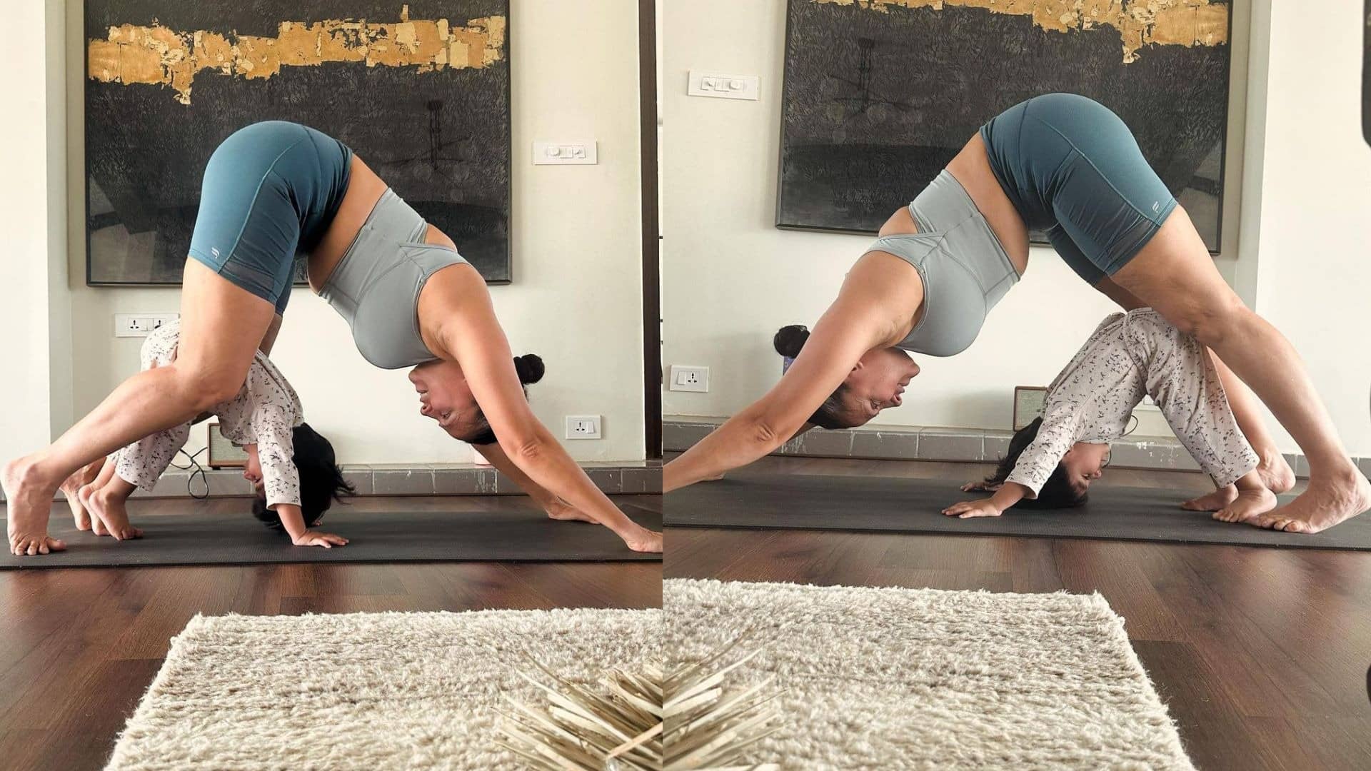 पूर्व मिस इंडिया को हरे रंग की योगा शॉर्ट्स और ग्रे रंग का स्पोर्ट्स टॉप पहने हुए देखा जा सकता है। तस्वीरों में उनके बेटे गुरिक को अपनी मां की तरह ही योग मुद्रा करते हुए दिखाया गया है।