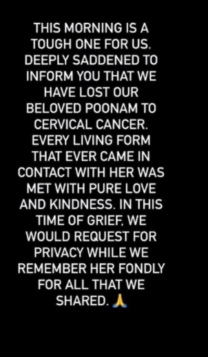 पूनम पांडे के निधन की जानकारी उनके आधिकारिक इंस्टाग्राम हैंडल से मिली। शुक्रवार को सुबह में करीब 11 बजे एक पोस्ट आया जिसमें लिखा था- ''आज की सुबह हमारे लिए कठिन है। आपको यह बताते हुए बहुत दुख हो रहा है कि हमने सर्वाइकल कैंसर के कारण अपनी प्यारी पूनम को खो दिया है। हर जीवित रूप जो कभी भी उनके संपर्क में आया, उसे शुद्ध प्रेम और दयालुता मिली। दुःख की इस घड़ी में, हम गोपनीयता का अनुरोध करेंगे जबकि हम उसे हमारे द्वारा साझा की गई हर बात के लिए प्रेमपूर्वक याद करेंगे।''