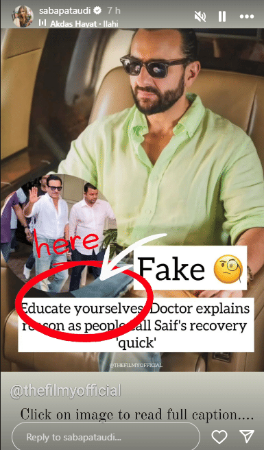 सैफ अली खान की बहन सबा पटौदी ने अपनी इंस्टाग्राम स्टोरीज पर द फिल्मी ऑफिशियल की पोस्ट को दोबारा साझा किया, जिसमें लिखा है, "खुद को शिक्षित करें।'' उन्होंने आगे लिखा, ''लोगों ने सैफ के जल्दी ठीक और रिकवर होने की बात कही है, जिसके बाद डॉक्टरों ने इसके पीछे की वजह समझाई है। सबा ने आगे लिखा कि पूरी बात समझने के लिए नीचे इमेज पर क्लिक करें।