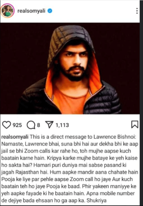 सोमी अली ने अपने इंस्टाग्राम हैंडल पर लिखा, ''यह लॉरेंस बिश्नोई के लिए एक सीधा संदेश है: नमस्ते, लॉरेंस भाई, सुना भी है और देखा भी है कि आप जेल से भी जूम कॉल कर रहे हैं। मुझे आपसे कुछ बातें करनी है। कृपा करके मुझे बताएं कि ये कैसे हो सकता है? हमारी पूरी दुनिया में सबसे पसंद की जगह राजस्थान है। हम आपके मंदिर आना चाहते हैं पूजा के लिए लेकिन पहले आपसे जूम कॉल हो जाए और कुछ बातें हो जाएं।''