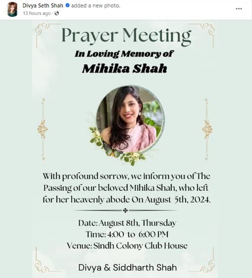 मां दिव्या सेठ ने फेसबुक पर लिखा, 'बहुत दुख के साथ, हम आपको हमारी प्यारी मिहिका शाह के निधन की सूचना देते हैं, जो 5 अगस्त, 2024 को हम सभी को अलविदा कह गई।'