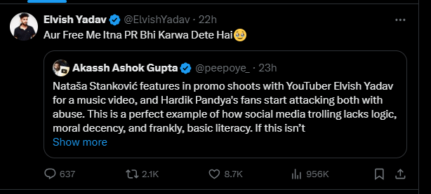 टीम इंडिया के स्टार क्रिकेटर हार्दिक पांड्या से अलग होने के बाद नताशा कुछ दिनों के लिए अपने बेटे अगस्त्य को लेकर सर्बिया चली गईं थीं। वहां से लौटने के बाद उन्होंने मुंबई में फिर से मॉडलिंग और एक्टिंग शुरू की। हाल के दिनों में उन्होंने कुछ वीडियो पोस्ट किया है जिससे पता चलता है कि वो किसी गाने में डांस करने वाली हैं। इस बीच उन्होंने यूट्यूबर एल्विश यादव के साथ भी पोस्ट शेयर किया जो तेजी से वायरल हो रहा है। सोशल मीडिया पर आकाश गुप्ता नाम के एक यूजर ने लिखा कि नताशा स्टेनकोविक एक म्यूजिक एल्बम के लिए एल्विश यादव के साथ शूट कर रहीं थीं। उन्हें देखकर हार्दिक पांड्या के फैंस दोनों को गाली-गलौज कर रहे हैं। यह एक बेहतरीन उदाहरण है कि कैसे सोशल मीडिया पर ट्रोलिंग में तर्क, नैतिक शालीनता और स्पष्ट रूप से बुनियादी साक्षरता का अभाव है। अगर ये वास्तविक निरक्षता नहीं है तो फिर क्या है?