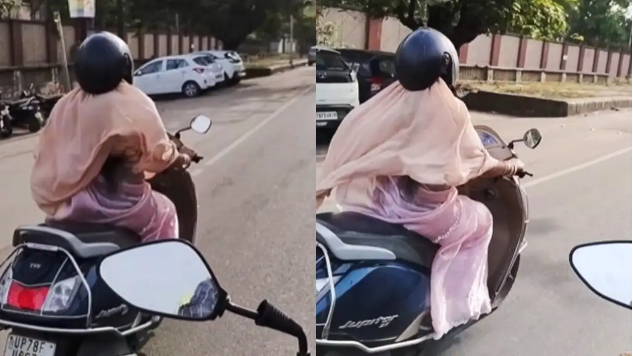Kanpur Helmet Viral Video: जिस वीडियो की हम बात कर रहे हैं, उसमें एक महिला को बड़े अनोखे अंदाज में हेलमेट लगाए देखा जा सकता है।