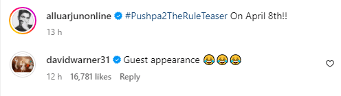 अल्लू अर्जुन ने जैसे ही टीजर की तारीख बताई ऑस्ट्रेलियाई स्टार क्रिकेटर डेविड वॉर्नर से रहा नहीं गया और उन्होंने कमेंट सेक्शन में जाकर मजेदार बात लिख दी जिसके बाद फैंस थोड़े कन्फ्यूज हो गए। वॉर्नर ने लिखा, मैं गेस्ट रोल में हूं (हंसते हुए इमोजी के साथ)। उनका ये कमेंट तेजी से वायरल हो रहा है। कई यूजर्स ने तो कह दिया कि वो वॉर्नर को पुष्पा के भाई के रोल में देखना चाह रहे हैं।