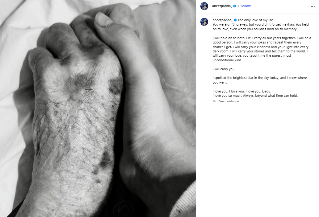 अनीत पड्डा ने इंस्टाग्राम पर एक ब्लैक एंड व्हाइट फोटो शेयर की है, जिसमें वह अपने दादा का हाथ थामे नजर आ रही हैं। इस तस्वीर के साथ उन्होंने अपने दिल की भावनाएं साझा करते हुए उनके निधन की खबर दी है।