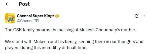 चेन्नई सुपर किंग्स ने 'X' पर इस दुखद खबर की पुष्टि की। मुकेश चौधरी इस समय मुंबई में टीम के साथ थे, लेकिन खबर मिलते ही वह तुरंत अपने गृहनगर भीलवाड़ा, राजस्थान के लिए रवाना हो गए हैं।