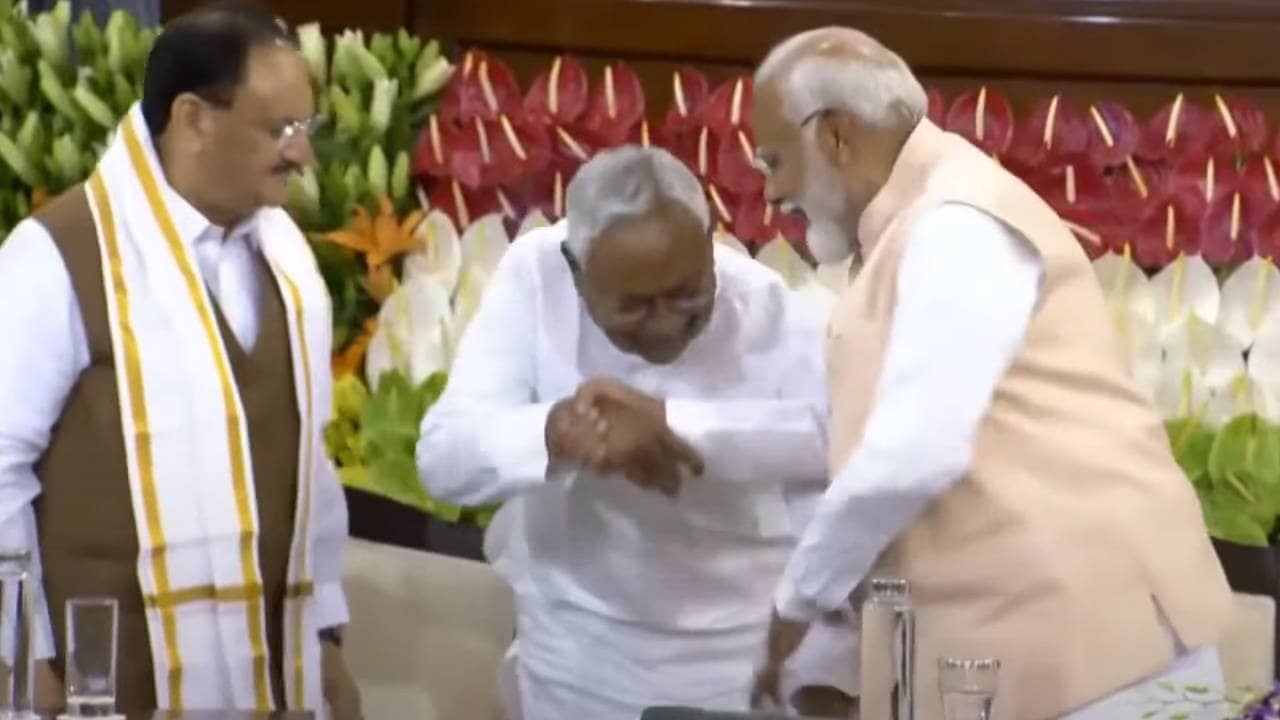 सेंट्रल हॉल में गजब का नजारा, भौचक्के रह गए नड्डा जब नीतीश झुके और मोदी के छूने लगे पैर फिर...