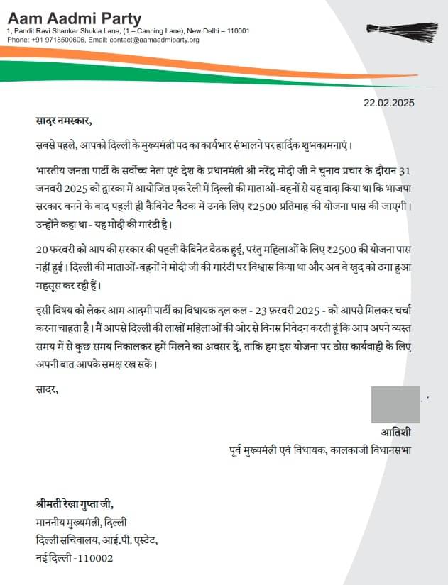 दिल्ली की पूर्व मुख्यमंत्री और AAP नेता आतिशी ने दिल्ली की मुख्यमंत्री रेखा गुप्ता को पत्र लिखकर दिल्ली में महिलाओं को 2500 रुपये प्रति माह देने की योजना के संबंध में 23 फरवरी को AAP विधायक दल से मिलने का समय मांगा है।