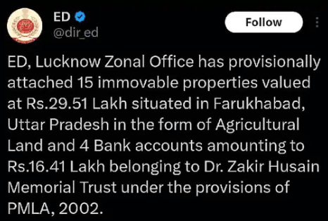 ईडी ने एक बयान में कहा कि उसने धनशोधन निवारण कानून (पीएमएलए) के प्रावधानों के तहत उत्तर प्रदेश के फर्रुखाबाद जिले में स्थित 15 कृषि भूखंड और डॉ. जाकिर हुसैन मेमोरियल ट्रस्ट की कुछ बैंक जमा राशि को अस्थायी रूप से कुर्क कर लिया है। इसमें कहा गया है कि कुर्क किये गये भूखंडों का मूल्य 29.51 लाख रुपये है और ट्रस्ट के चार बैंक खातों से कुर्क राशि 16.41 लाख रुपये है।