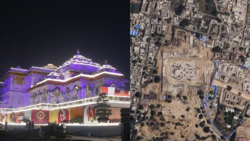 प्राण प्रतिष्ठा से एक दिन पहले 21 जनवरी को भारतीय सैटेलाइट्स से ली गई अयोध्या के राम मंदिर की तस्वीरें सोशल प्लेटफॉर्म पर आते ही छा गई हैं। इन तस्वीरों में 2.7 एकड़ का राम मंदिर स्थल दिख रहा है। दो तस्वीरें हैं एक 16 दिसंबर की जब निर्माण का काम चल रहा था और दूसरी हाल की जब राम लला की प्राण प्रतिष्ठा को मात्र एक दिन बच गया है। ताजा सैटेलाइट तस्वीरों में सरयू नदी, दशरथ महल और अयोध्या रेलवे स्टेशन भी साफ नजर आ रहा है। हालिया तस्वीर में नया रेलवे स्टेशन भी दिख रहा है।