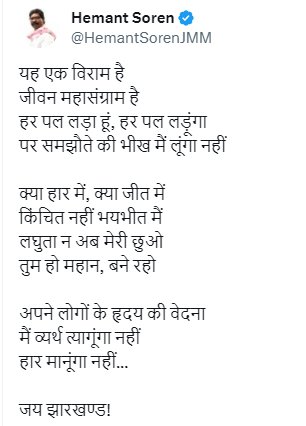 हेमंत सोरेन ने लिखा, ''यह एक विराम है, जीवन महासंग्राम है। हर पल लड़ा हूं, हर पल लड़ूंगा पर समझौते की भीख मैं लूंगा नहीं। क्या हार में, क्या जीत में, किंचित नहीं भयभीत मैं, लघुता न अब मेरी छुओ। तुम हो महान, बने रहो। अपने लोगों के हृदय की वेदना, मैं व्यर्थ त्यागूंगा नहीं, हार मानूंगा नहीं... जय झारखण्ड।