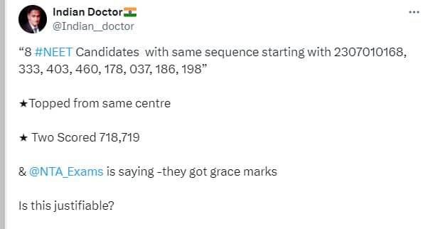 NEET UG का रिजल्ट पीडीएफ सोशल मीडिया पर तेजी से वायरल हो रहा है। पीडीएफ में टॉपर लिस्ट को लेकर सवाल खड़े किए जा रहे हैं। कहा जा रहा है कि सीरियल नंबर 62 से लेकर 69 तक नीट रोल नंबर, नाम मार्क्स और स्कोर वाले या तो एक ही सेंटर से हैं या फिर आस पास के सेंटर वाले हैं। इनमें से ज्यादातर उम्मीदवारों के नाम से सरनेम गायब है। ऐसे में स्टूडेंट्स की मांग है कि एग्जाम फिर से ली जाए। लेकिन, कोर्ट ने इस मामले में पेपर रद्द करने का फैसला नहीं सुनाया।