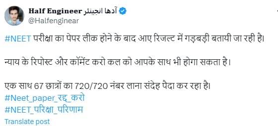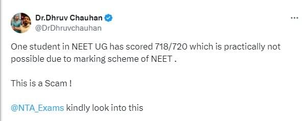 सोशल मीडिया पर नीट रिजल्ट 2024 ट्रेंड कर रहा है। मीडिया रिपोर्ट्स की मानें तो इसका कारण है कि कई नीट कैंडिडेट्स ने रिजल्ट को स्कैम बताया है। स्टूडेंट्स फिर से एग्जाम लेने की मांग कर रहे हैं। इसे लेकर डॉ ध्रुव चौहान नाम के एक ब्लू टिक एक्स यूजर ने लिखा, "एक स्टूडेंट ने NEET UG में 718/720 स्कोर किया है, जो कि NEET की मार्किंग सिस्टम की वजह से प्रैक्टिकली पॉसिबल नहीं है। यह एक स्कैम है। NTA इस मामले को देखे।"