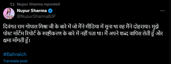 Nupur Sharma News: बहराइच हिंसा में मारे गए रामगोपाल मिश्रा पर बयान देने के बाद नूपुर शर्मा ने सोशल मीडिया के जरिए माफी मांगी है।