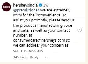हर्षे ने प्रतिक्रिया दी है। इस घटना पर अफसोस जताया है। सोशल मीडिया पर अपने प्रोडक्ट की वजह से हुई असुविधा के लिए माफी मांगते हुए कस्टमर से मैनुफैक्चरिंग कोड और तारीख मांगी है। पोस्ट में लिखा है कि आप कस्टमर केयर के जरिए शिकायत दर्ज करा सकती हैं। जिससे आपकी परेशानी को अड्रेस किया जा सके।