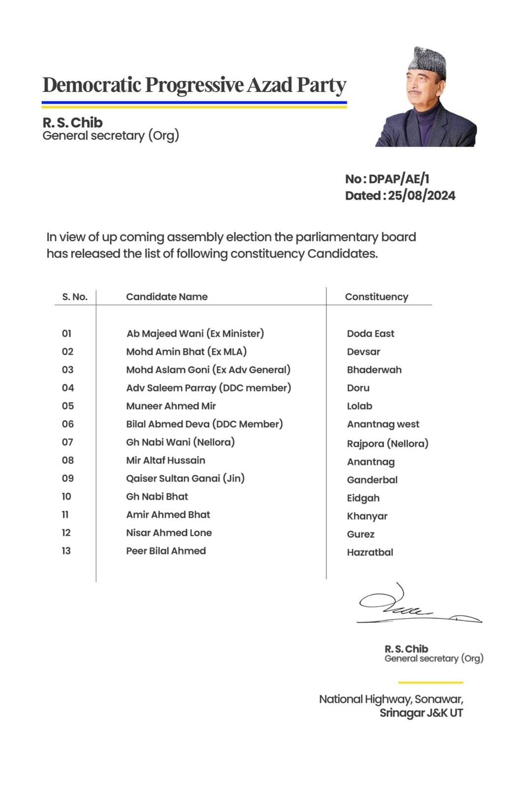 India News Live: जम्मू-कश्मीर में हर पार्टी ने विधानसभा चुनाव के लिए अपनी-अपनी ताकत लगाना शुरू कर दिया है। पहले चरण की अधिसूचना और PDP का चुनावी घोषणापत्र जारी होने के बाद अब गुलाम नबी आजाद की पार्टी डेमोक्रेटिक प्रोग्रेसिव आजाद पार्टी (DPAP) ने प्रत्याशियों की पहली लिस्ट जारी करदी है। पार्टी ने अपनी पहली लिस्ट में 13 सीटों पर प्रत्याशियों का ऐलान किया है।